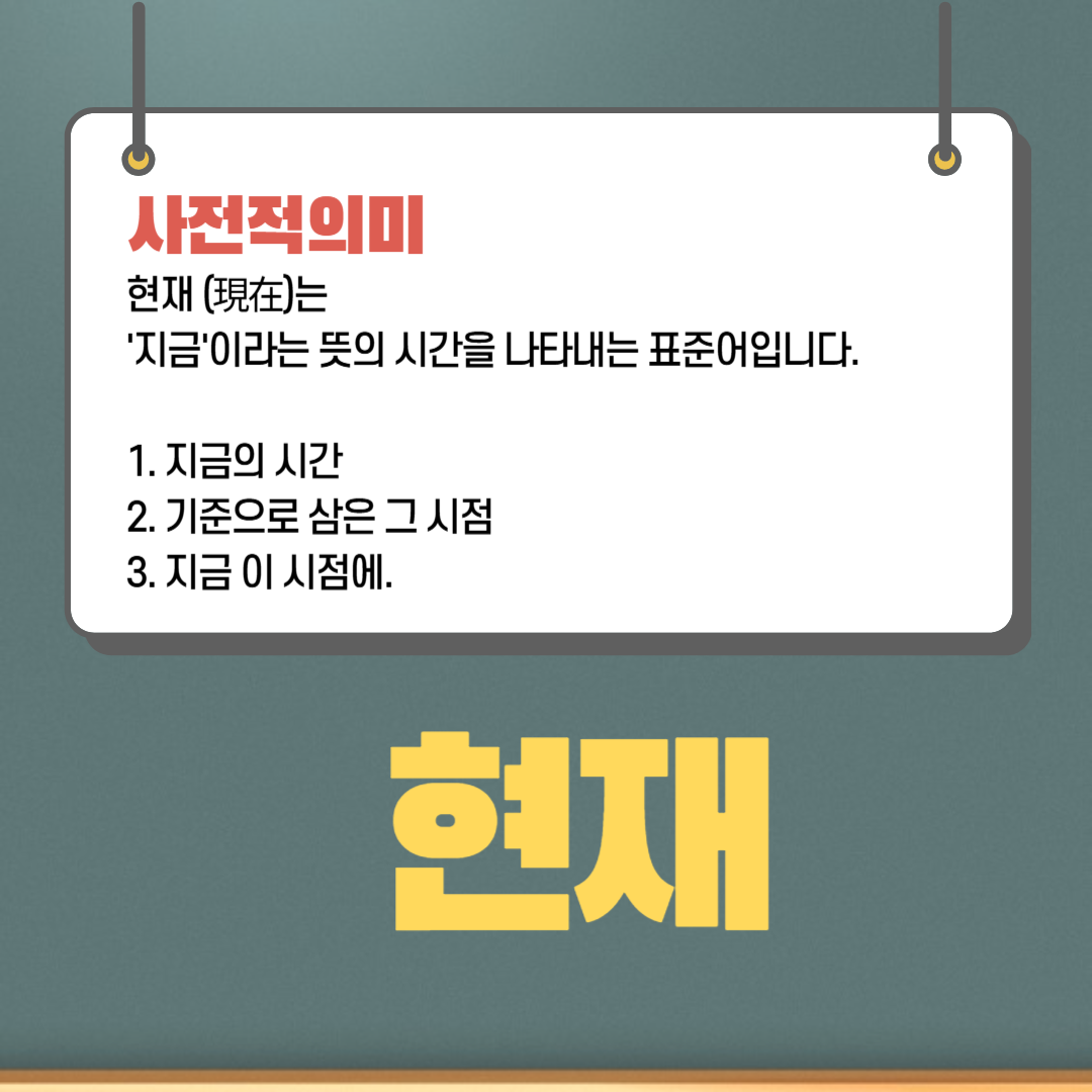 현재 (現在)는 '지금'이라는 뜻의 시간을 나타내는 표준어입니다.